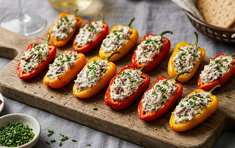 1. Halve the mini peppers lengthways and remove the seeds. Arrange them cut-side up on a serving platter.